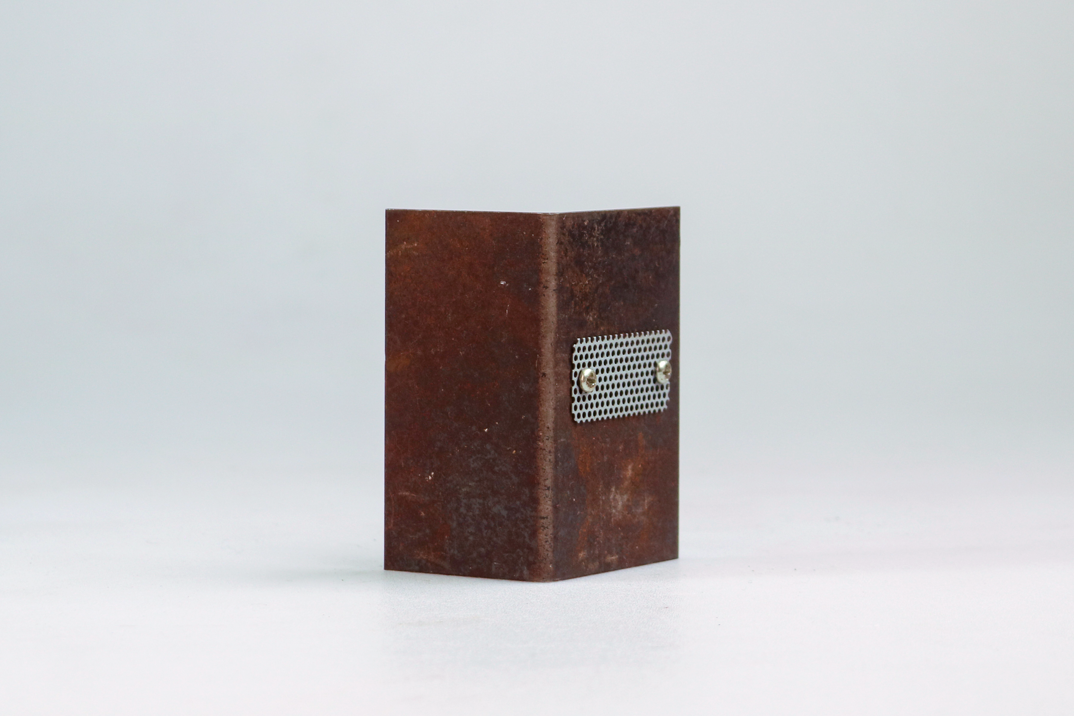 INFO. TÉCNICA: De la serie 000. 005. 2020. DECAdry, pieza electrónica y plancha de metal. (70 x 37 x 35 cm.)