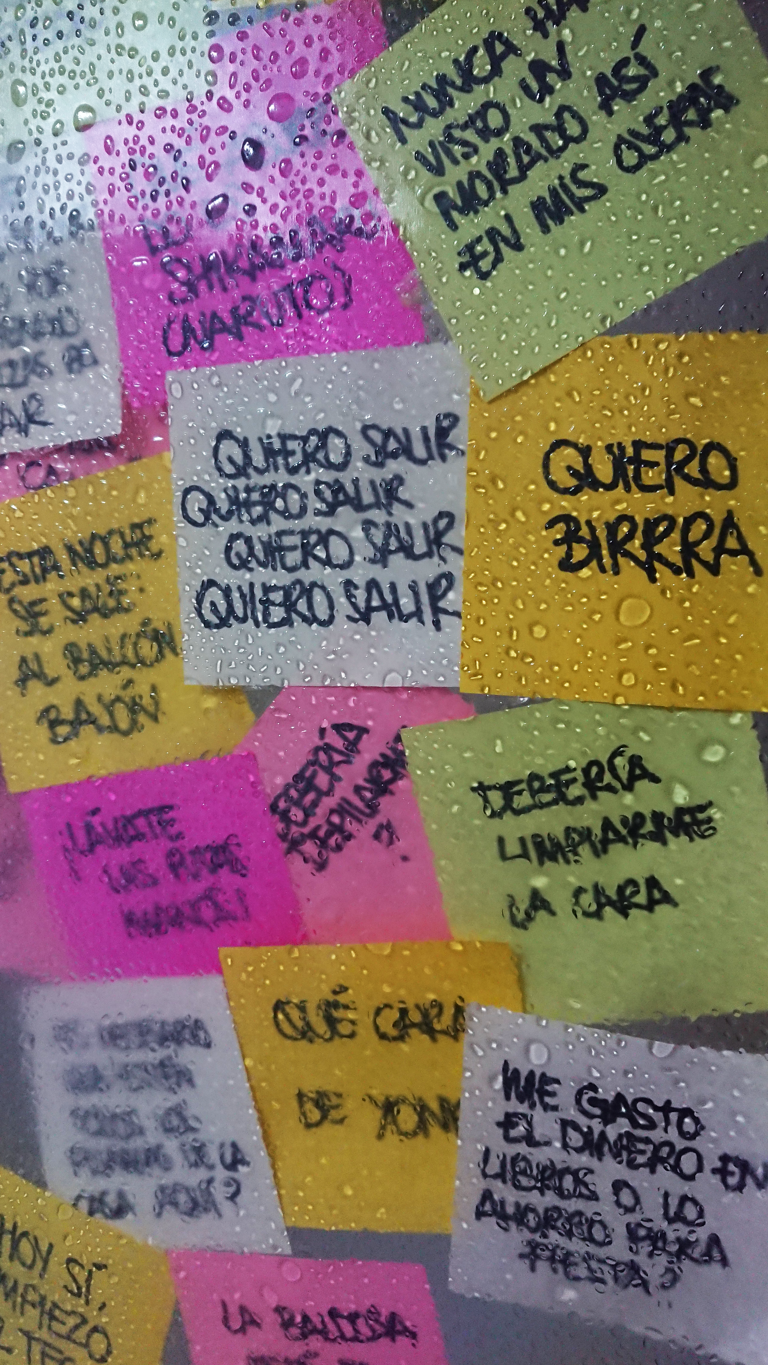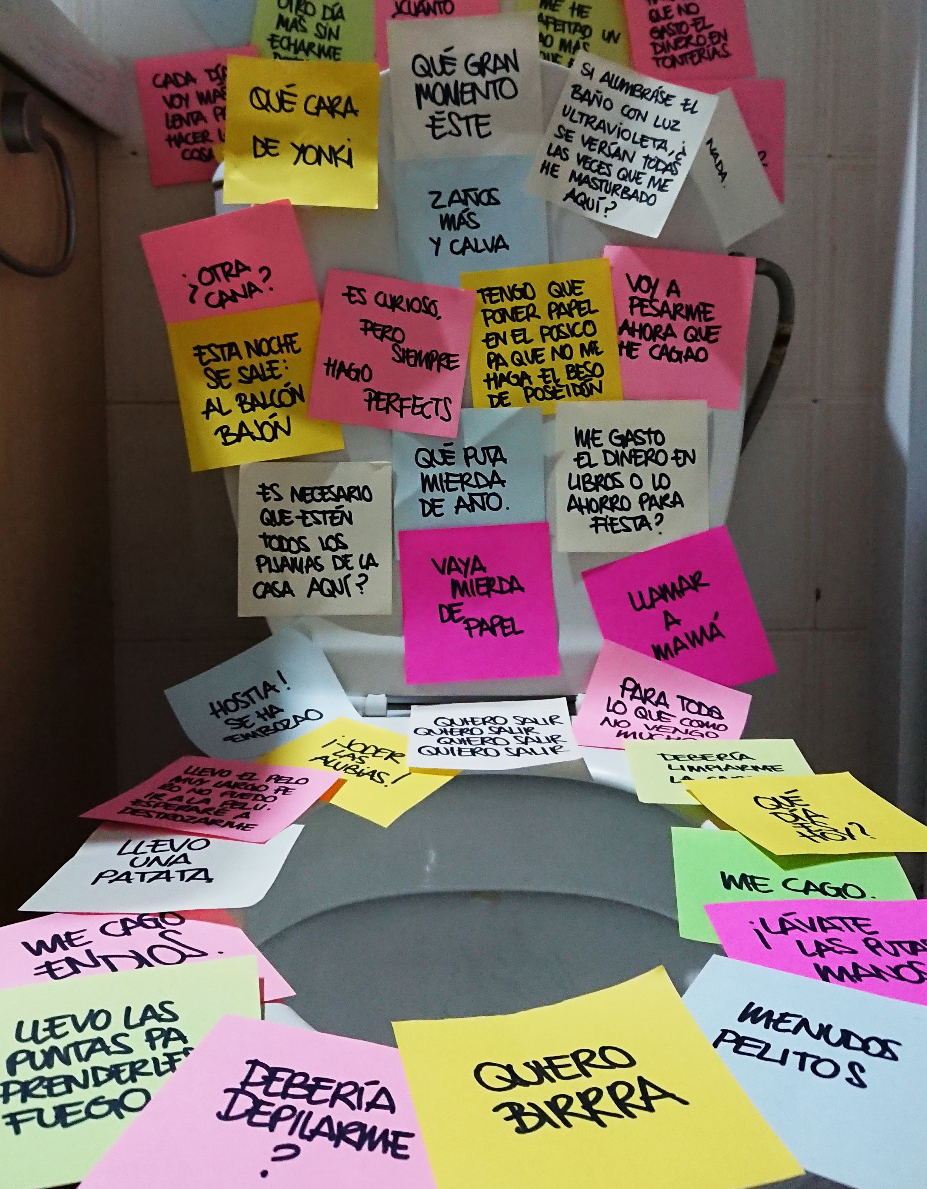 ‘’Mi intención era crear algo colectivo y gracioso, dentro de la situación que estamos viviendo. Pregunté a varias personas (15-20aprox) qué era lo que pensaban mientras estaban en el baño, y escogí las respuestas que más me gustaron y no se repetían y las coloqué formando un tablón de ideas colectivo y divertido, con una estética colorida y alegre que contrastan entre sí; dónde cada una de nosotras nos hemos visto reflejadas en algún momento.’’